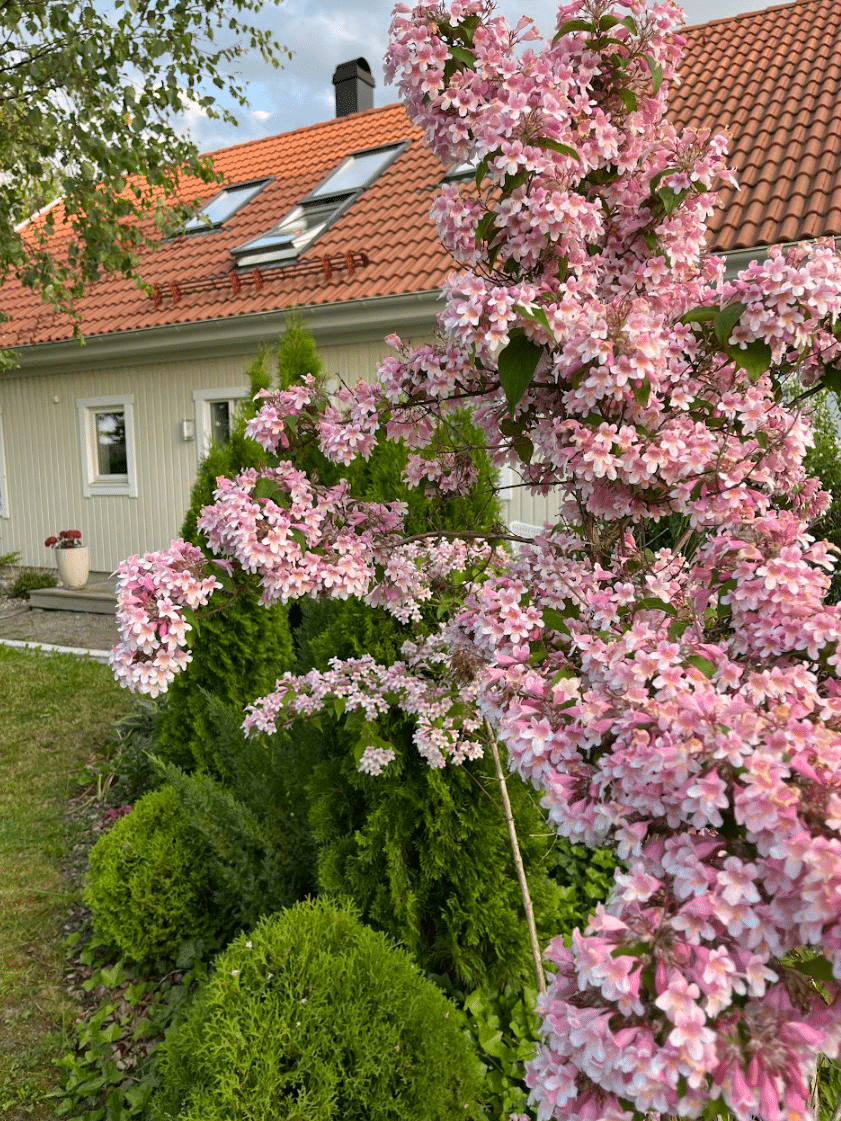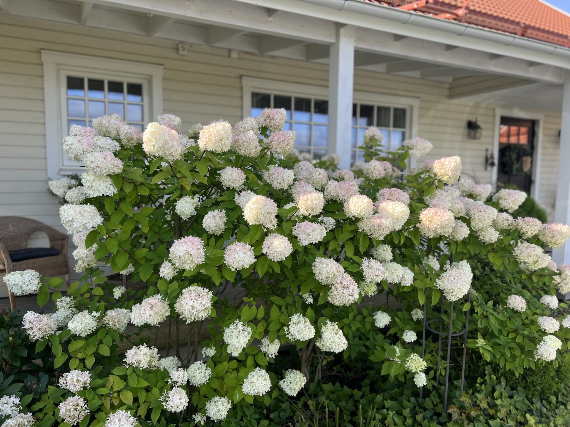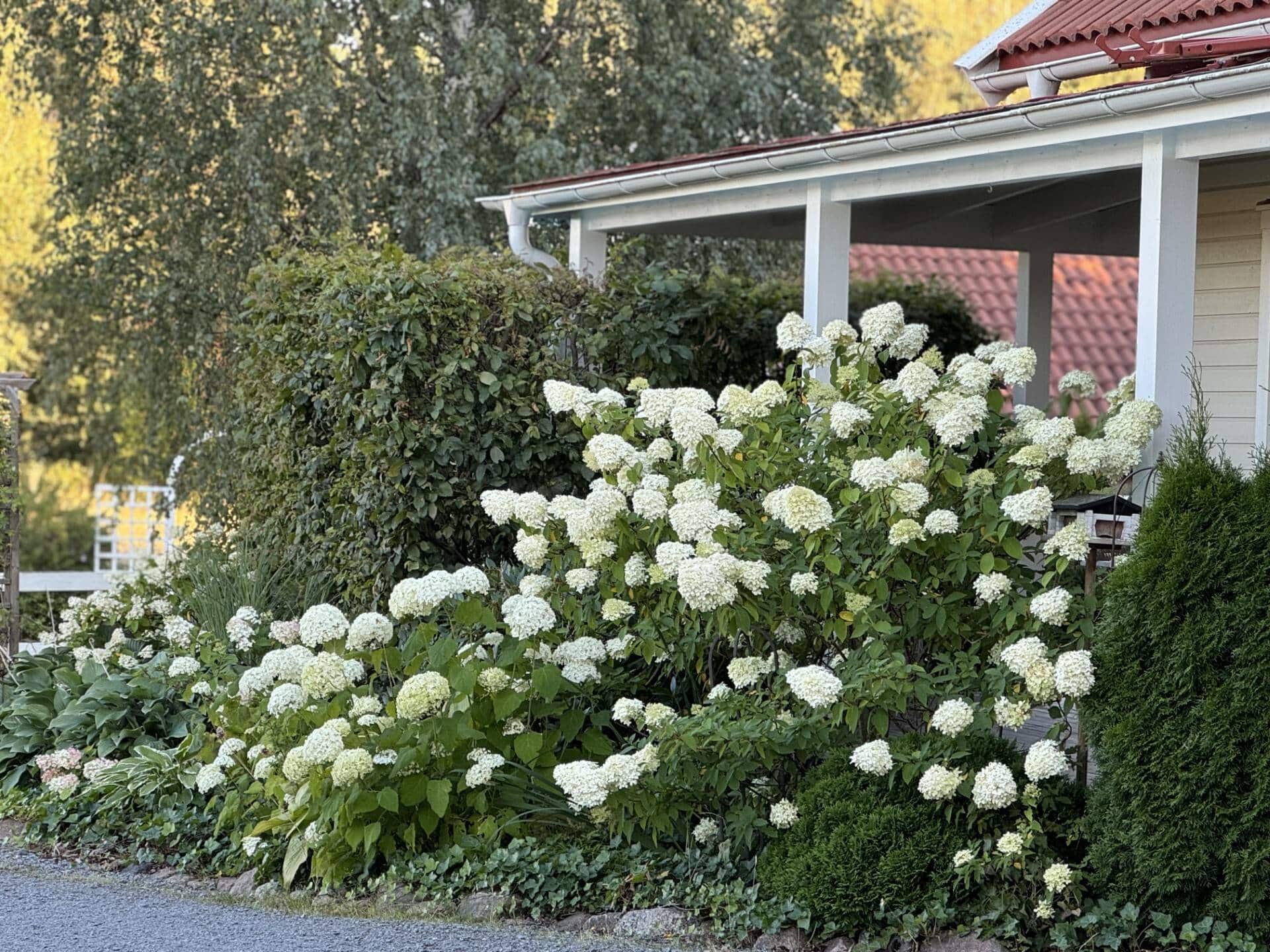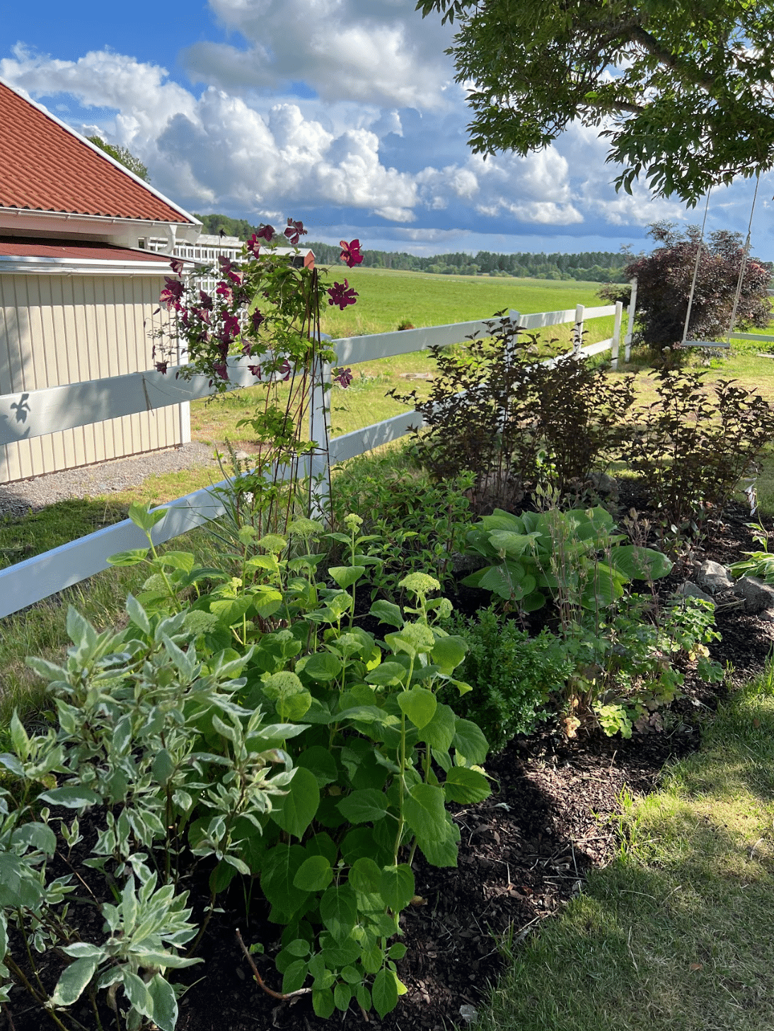 Frida på Hutchings Garden hjälpte oss både med idé och genomförande, att få till en mysig ombonad passage till entrén med en rundad rabatt invid grusgången. Den fungerar både som insynsskydd och har även gett rumskänsla till trädgården. Dessutom genialiskt att addera en portal och spaljé invid. Njuter av att sitta där på sommaren skyddad av grönskan. De vintergröna buskarna är dessutom fina året om. Kunde inte blivit bättre.